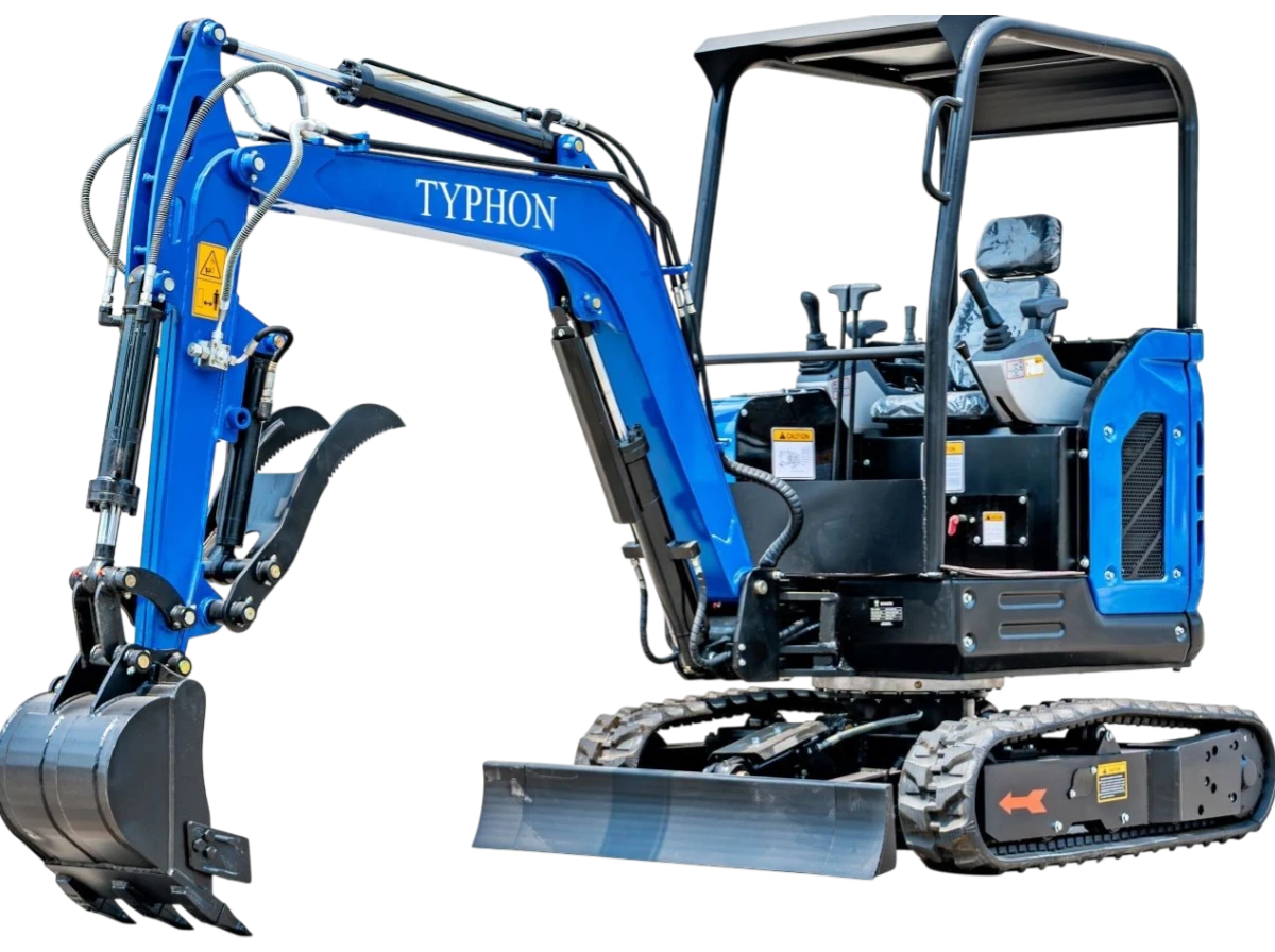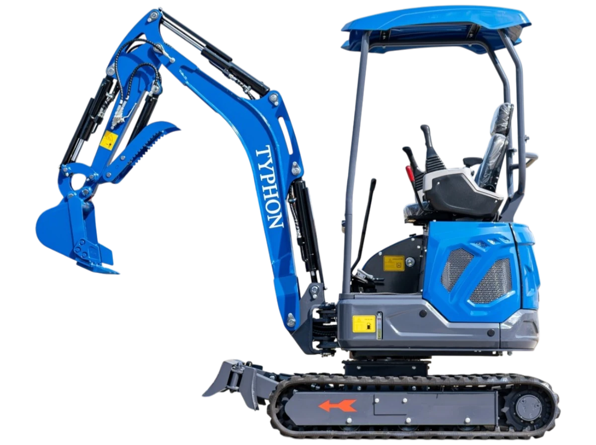 The TYPHON TERROR ONE STORM Mini Excavator is a 1-ton trench digger with a canopy and a hydraulic thumb clip. It’s ideal for minor building jobs. This little but powerful machine is designed to be easy to move around and work well in a variety of places, such as farms, gardens, parks, orchards, and more..