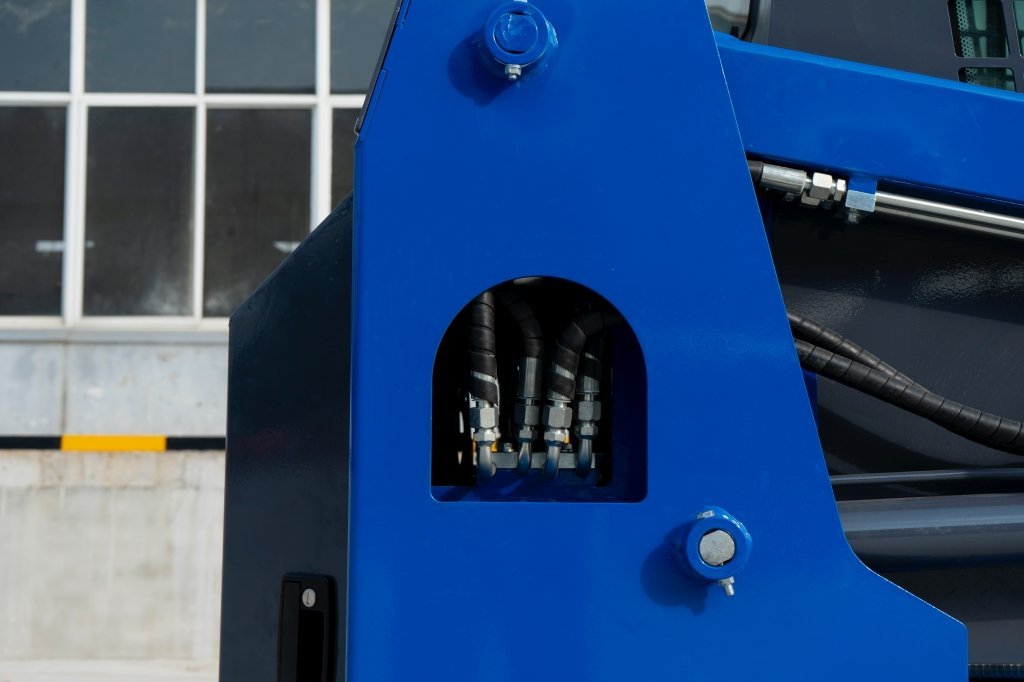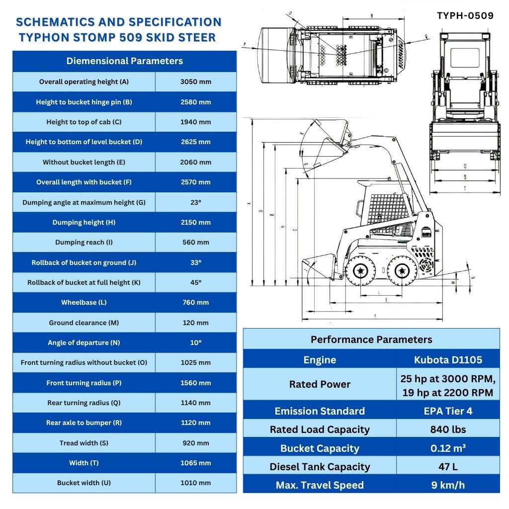 The TYPHON STOMP 509 has an operational weight of 1.4 ton and a transport length of 2570mm with a bucket. The bucket width is 1010mm, and the maximum unloading height is 2150mm. With a dump reach of 560mm and dump angle of 33 degrees on the ground and a dump angle of 45 degrees at the highest point, the skid steer sports a radial lift height of 3050mm and a height to bucket pin of 2580mm.